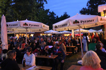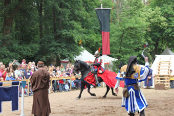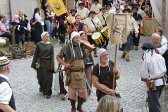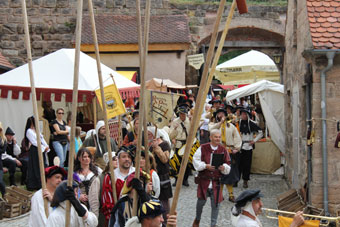 Anno 2012 machten wir uns zum ersten Mal zum Mittelalterfest in Hilpoltstein auf. Obwohl der Platz dort begrenzt ist, hatte Frau Quiring es geschafft, für uns noch einen wunderbaren Lagerplatz zu schaffen. Artikel Donaukurier vom 29.05.12 ![]() ![]() Wir kamen bereits einen Tag vor Festbeginn an, um in Ruhe unser Lager aufzubauen und Hilpoltstein zu erkunden. Gleich bei der Anreise bestaunten wir den schönen Stadtkern mit Fachwerkhäusern und verträumten Gassen. ![]() ![]() Über die Organisation durch Frau Quiring kann man wahrlich nur gutes Berichten. Jederzeit wurde man über Neues (z.B. Unwetterwarnung) informiert; bei Fragen wurde stets geholfen. Ein sicheres Gefühl gaben einem die netten Leute vom Security. Für uns Lager war Sanitär auch vorgesorgt, so dass wir uns in Ruhe für Duschen etc. zurück ziehen konnten. Holz war mehr als ausreichend vorhanden und man kann ohne Wenn und Aber sagen, dass es eines der besten Brennhölzer war. Das Wetter war das Wochenende über sogar gnädig und belohnte uns mit trockenen, warmen Temperaturen. Jeden Tag fand ein Umzug der Mitwirkenden durch Hilpoltstein statt, bei dem die Teilnehmer durch den Marktvogt auf heitere Art vorgestellt wurden. Ein schönes Gefühl durch die historischen Gassen zu gehen und die fröhlichen Gesichter der Leute zu sehen, bevor der Festzug wieder durch das alte Tor auf dem Gelände der Burgruine verschwand. ![]() ![]() Viele Leute strömten das Wochenende über auf das Fest, bestaunten die Schmiede von Simon Wackerl, das Turnier der Herzog Tassilo Ritter (in Rüstung und Abends mit Feuer) und auch wir durften uns über sehr viel Interesse an unserem Handwerk freuen. Gerade am Samstag war so viel los, dass wir glatt das Essen über den Tag vergessen hatten. ;) Das Turnier und die Feuershow konnten wir alle geniessen, da die Lager tolle Logenplätze am Turnierplatz hatten. So konnte auch der ein oder andere Besucher mit auf dem Arm eingeschlafenen Enkelkind oder Fussverletzungen bei uns im Lager auf einer Bank sitzen und dennoch das Spektakel mit erleben. ![]() ![]() Unsere Kinder waren den ganzen Tag beschäftigt, da es viele, tolle Sachen für sie zu erleben gab (z.B. Kinderturnier, Armbrustschießen, Mäuseroulette) Wir Damen deckten uns bei der Gärtnermeisterin mit Kräutern ein und wurden auch bei unserem Drechsler wieder fündig. Sehr freuten wir uns auch über unsere Besucher, die gleich nutzten, dass wir endlich mal in Franken lagerten. Vorallem der Überraschungsbesuch von Matsin war absolut gelungen. (Nächstes Jahr wieder, gell?) ![]() ![]() Geboten war auch eine Falknershow, die Besichtigung des Burgturms, Auftritte von Jolandolo, den Streunern und anderen im Gastrobereich. Es ist immernoch unglaublich, wie viele Leute sich auf dem Gelände tummelten. ![]() ![]() Das Fest war wirklich schön, das Ambiente traumhaft und auch der Himmel weinte in Strömen zum Abschied. Wir freuen uns jetzt schon auf 2013. Ein herzliches Danke an die tolle Orga. Pressestimmen und Besuchervideos: Artikel Donaukurier vom 04.06.12 "Es geht einem das Herz auf" Artikel Donaukurier vom 03.06.12 "Splitternde Lanzen und sprühende Funken" Besuchervideo 1 Besuchervideo 2 Galerie zum 10. Mittelalterfest Hilpoltstein |